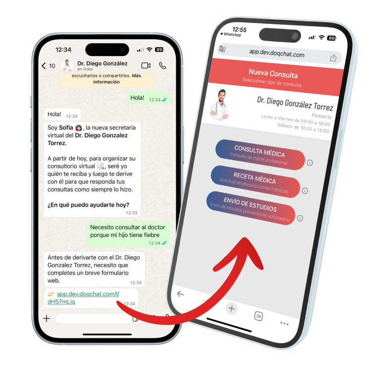 DoqChat es tu secretaria virtual en WhatsApp: recibe a tus pacientes de manera cordial, los guía en los primeros pasos y te los deriva para que continúes con tu atención como siempre lo hiciste. Vos decidís qué contactos debe atender el bot y estará disponible las 24 horas para recibir a tus pacientes, gestionar los pagos de tus honorarios y notificarte cuando corresponda. Lo mejor: no tenés que avisar nada a tus pacientes. Cuando te contactan (al número que siempre escriben) automáticamente serán atendidos por tu secretaria virtual, que les explicará todo lo necesario para comunicarse con vos. ¡Así de fácil!